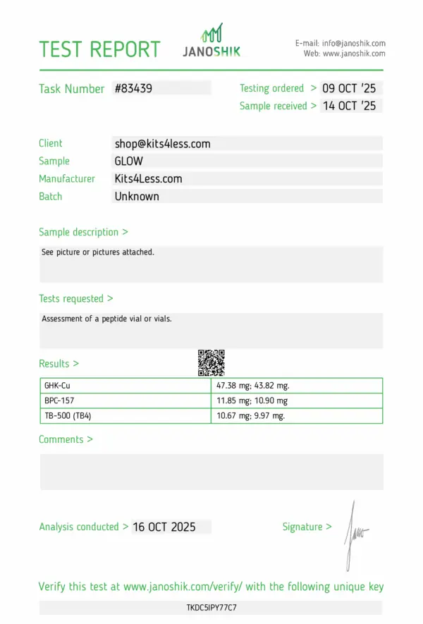 The Glow Protocol Peptide Blend is an advanced synergistic formulation consisting of  GHK-Cu, TB-500, and BPC-157, designed to enhance regenerative processes and support systemic recovery in non-human test subjects within controlled laboratory environments.